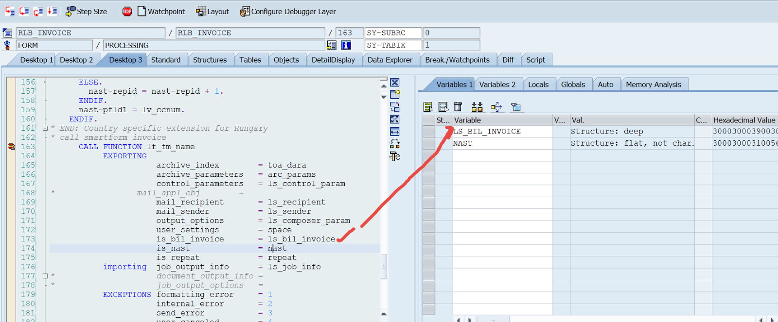 Step26. The break point is triggered. Double click on the variable LS_BIL_INVOCIE.